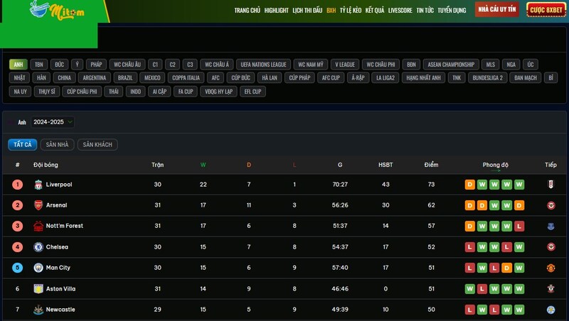 My Tom TV cung cấp bảng xếp hạng của các giải đấu bóng đá lớn trên thế giới như bảng xếp hạng bóng đá anh, La Liga, Serie A, Ligue 1 và nhiều giải đấu khác. Các bảng xếp hạng được cập nhật thường xuyên, giúp bạn theo dõi sự thay đổi thứ hạng của các đội bóng yêu thích. Bạn có thể dễ dàng xem được số điểm, số bàn thắng, hiệu số và các thống kê quan trọng khác, giúp bạn nắm bắt tình hình của các giải đấu một cách nhanh chóng và chính xác.